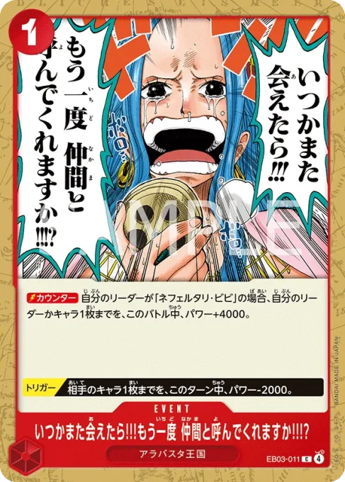 | テキスト 【カウンター】自分のリーダーが「ネフェルタリ・ビビ」の場合、自分のリーダーかキャラ1枚までを、このバトル中、パワー+4000。 | |||