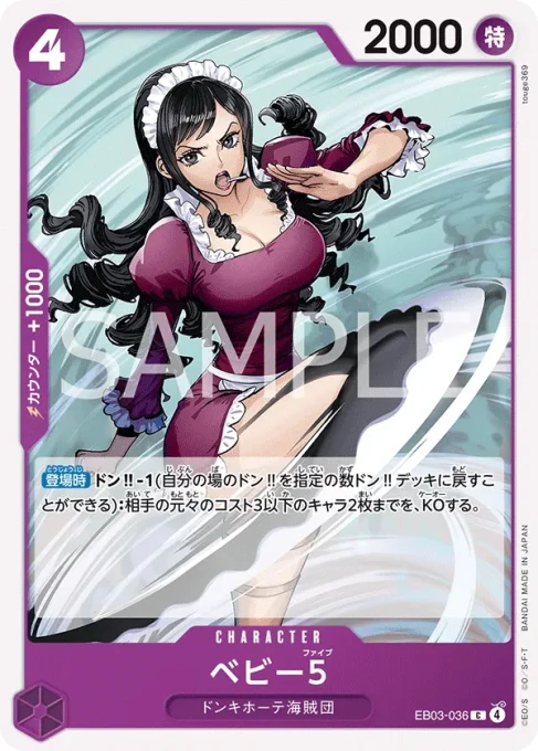| テキスト 【登場時】自分の特徴《ワノ国》を持つリーダーにレストのドン‼3枚までを、付与する。 【KO時】相手のライフの上から1枚までを、トラッシュに置く。 | |||