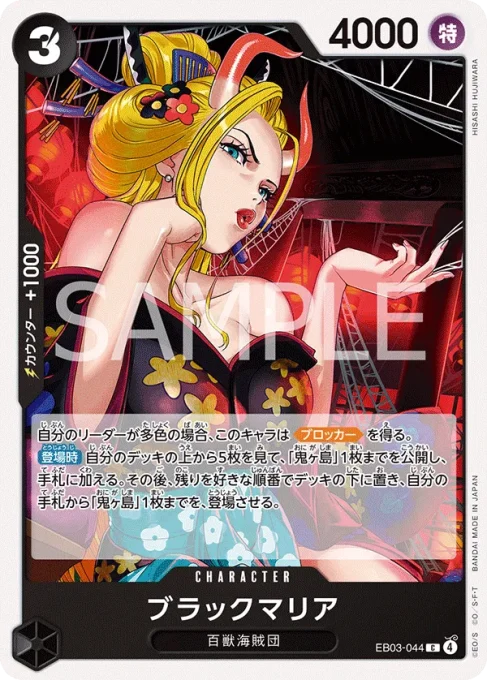 | テキスト 自分のリーダーが多色の場合、このキャラは【ブロッカー】を得る。 【登場時】自分のデッキの上から5枚を見て、「鬼ヶ島」1枚までを公開し、手札に加える。その後、残りを好きな順番でデッキの下に置き、自分の手札から「鬼ヶ島」1枚までを、登場させる。 | |||