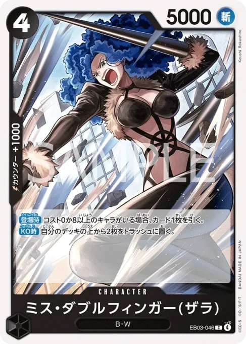 | テキスト 【メイン】自分のリーダーが「ナミ」の場合、自分のデッキの上から4枚を見て、コスト2から8のカード1枚までを公開し、手札に加える。その後、残りを好きな順番でデッキの下に置く。 | |||