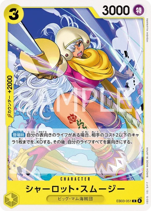 | テキスト 【登場時】自分のライフの上から1枚をトラッシュに置くことができる:自分のリーダーが特徴《麦わらの一味》を持つ場合、自分のデッキの上から2枚までを、ライフの上に加える。 【相手のターン中】【KO時】相手に1ダメージを与えてもよい。 | |||