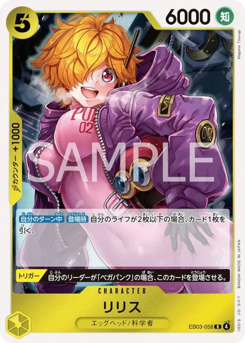 | テキスト 【登場時】自分のリーダーが特徴《エッグヘッド》を持ち、自分のライフが2枚以上の場合、自分の手札から【トリガー】を持つキャラカード1枚までを、ライフの上に表向きで加える。 | |||